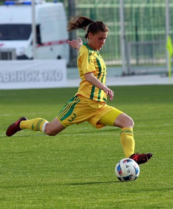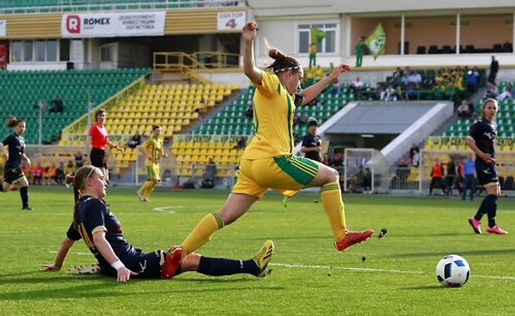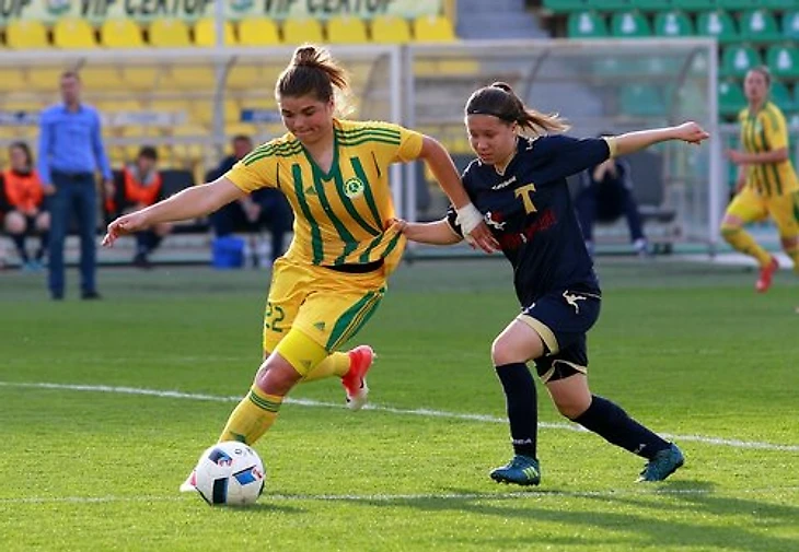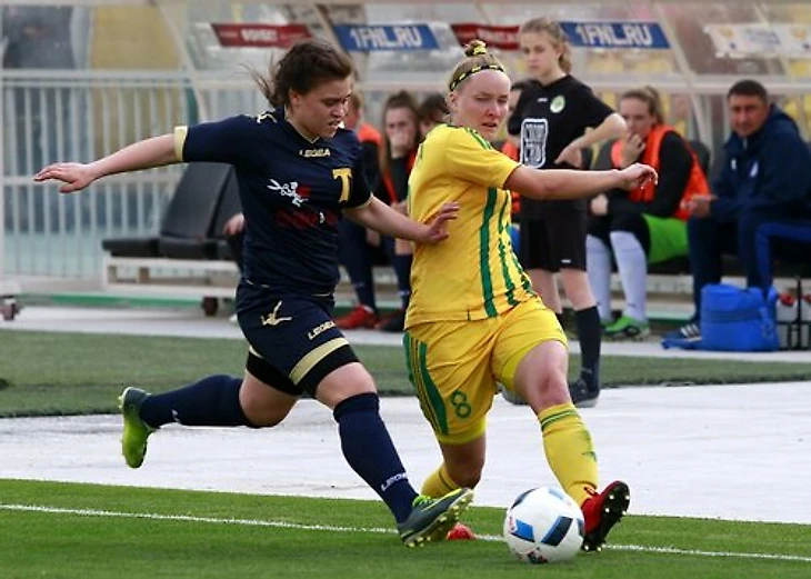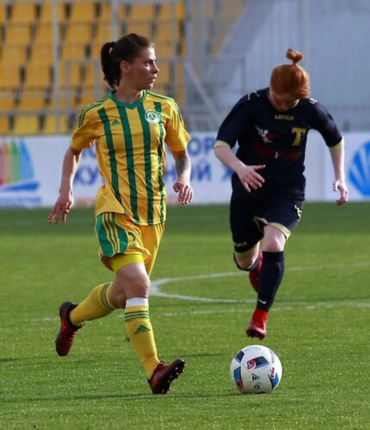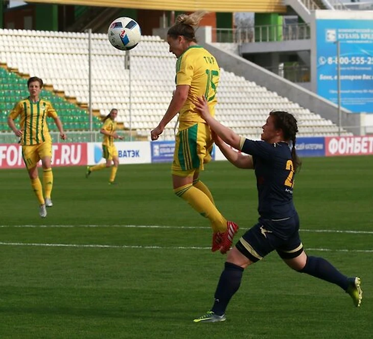 А стартовала она в умеренном ритме, с территориальным перевесом коллектива Татьяны Зайцевой, однако игроки Константина Кайгородова в качестве одного из дебютантов Высшего дивизиона тоже не собирались проводить поединок в глухой обороне, проводя и свои неплохие атаки, которые носили в себе острый характер. Да, как я уже упомянул, желто-зеленые были лучше в контроле мяча, но вот создать опасные голевые моменты им не сразу удалось. Так, на 11-ой минуте с правого фланга капитан краснодарского клуба Яна Чуб сделала навес на дальний край штрафной, где набежавшая Ольга Тир головой пробила мимо рамы Анастасии Климовой.