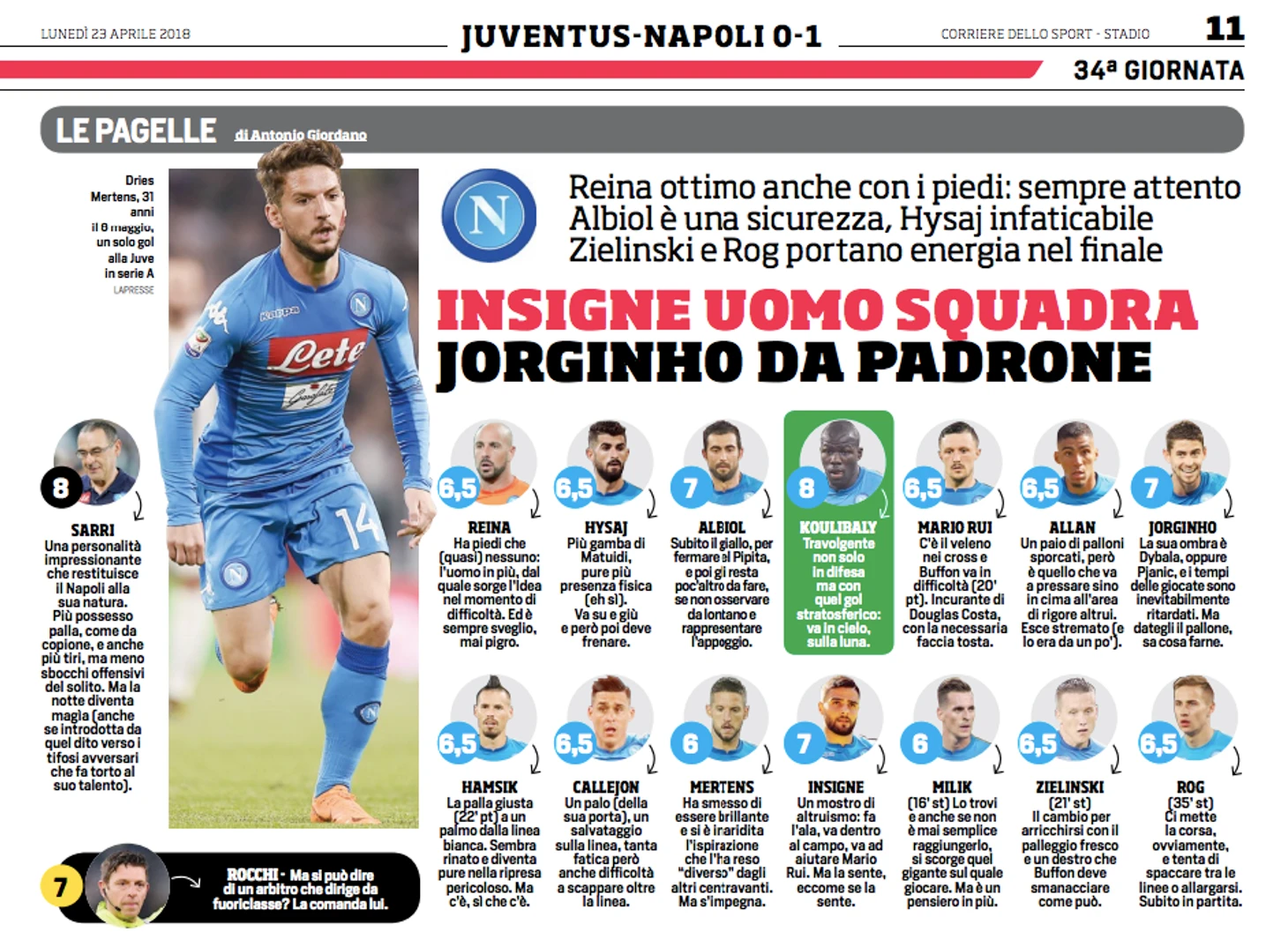 Сарри сотворил тактический шедевр. Наполи был идеален и не позволил Юве создать ничего у своих ворот. Достаточно взглянуть на статистику: Юве ни разу не пробил в створ, попал в штангу со штрафного благодаря рикошету и сделал на 220 пасов меньше, чем Наполи, который организовал три голевых момента и спокойно выждал свой шанс».