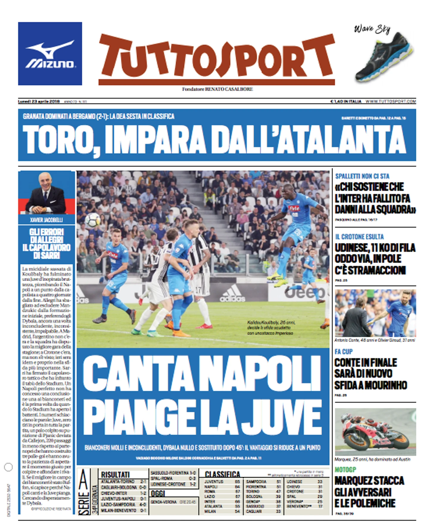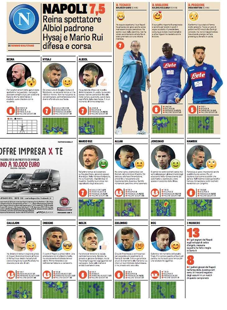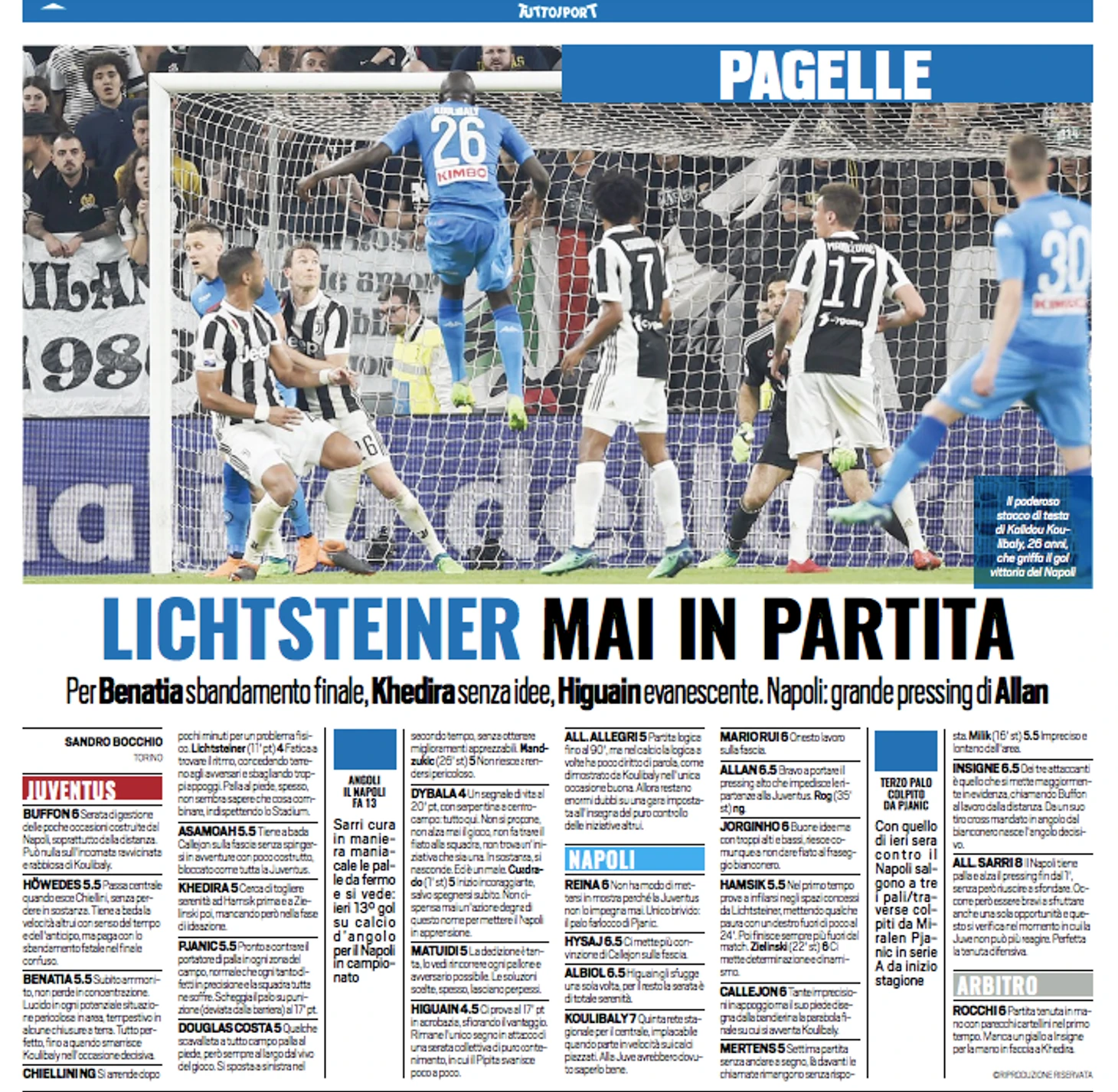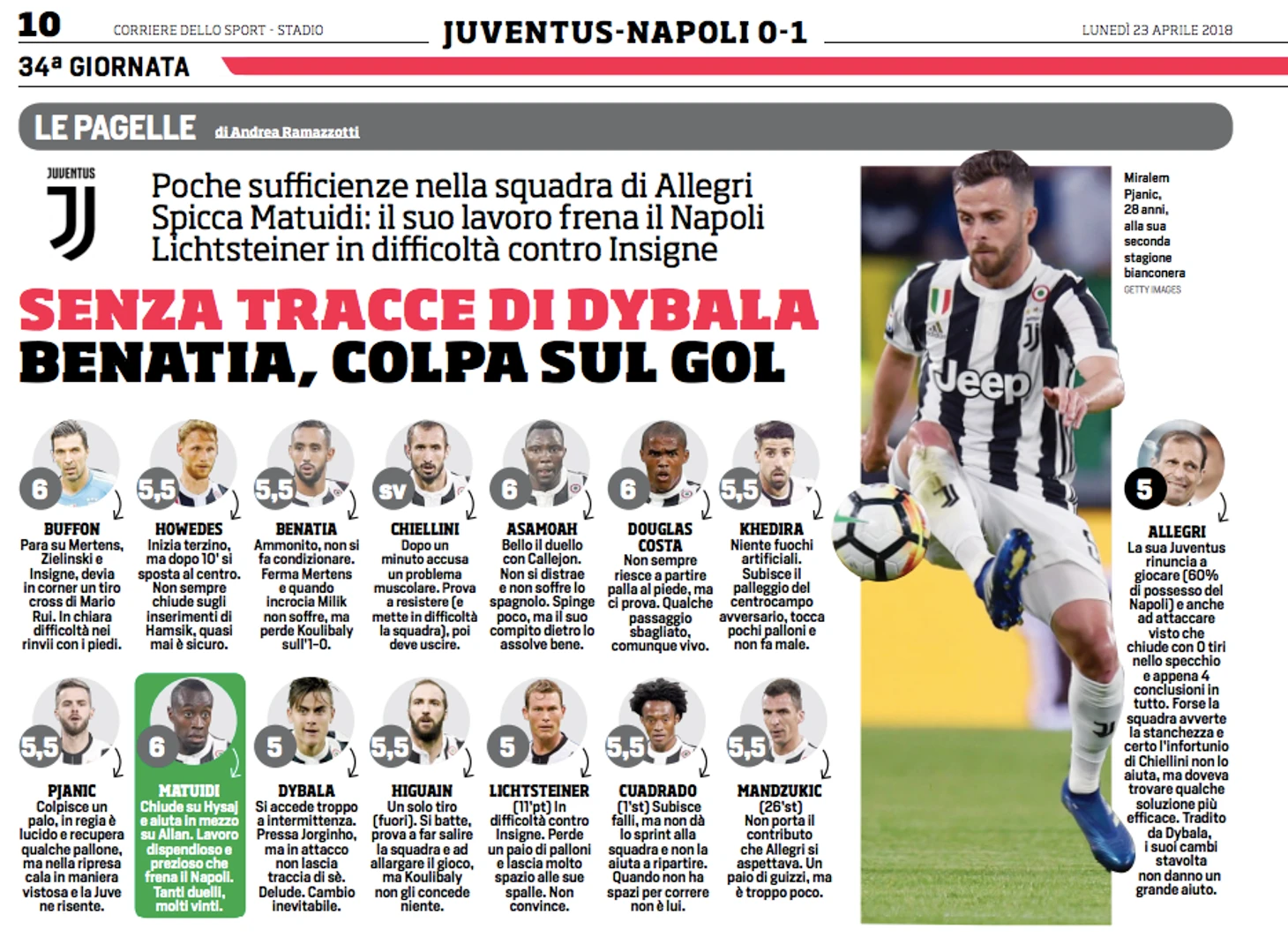 Наполи, прямо скажем, играл лучше. Буффон не делал невероятных сейвов, но гости показывали свое преимущество, а Ювентус только надеялся на 0:0. Некоторых игроков было не узнать: матч провалили Игуаин, Дибала, Хедира. Лучшим стал Буффон, и это лучшая характеристика игры. Игры, которая вызывает много вопросов к Аллегри. Например, правильно ли было оставлять в запасе Манджукича? И если Ювентус собирался обороняться, не логичнее было бы усложнить задачу Наполи, выпустив трех центрбеков?».