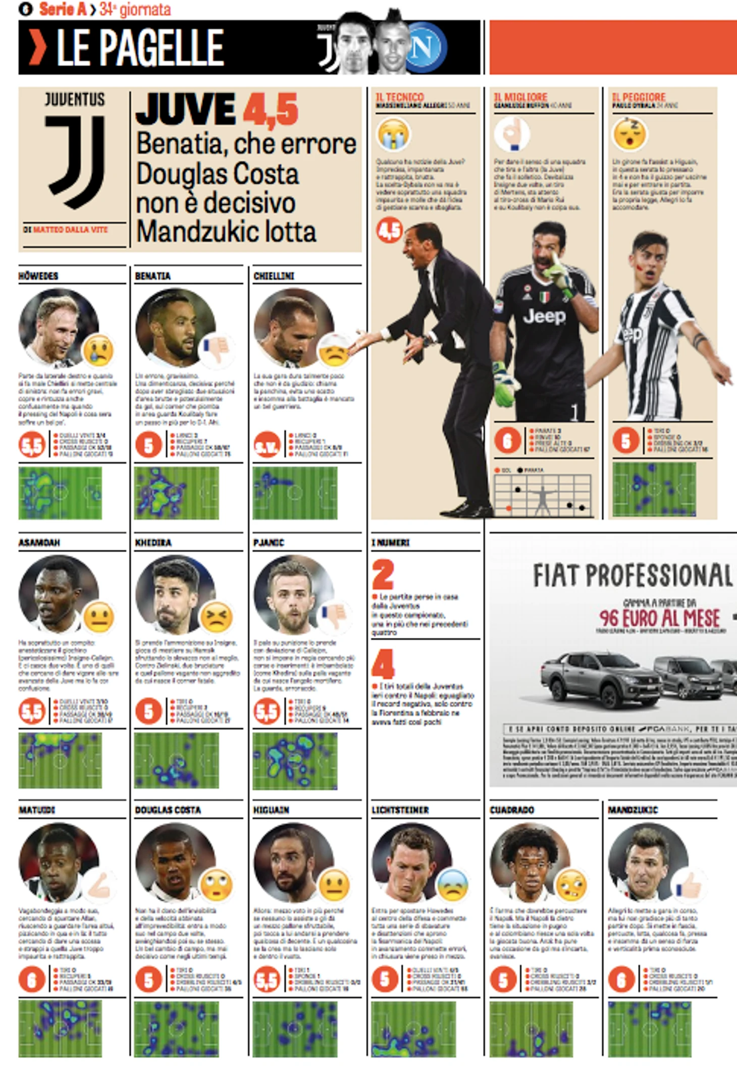 «Убийственный удар Кулибали сразил неожиданно очень плохо сыгравший Ювентус. Аллегри ошибся, оставив в запасе Манджукича и выбрав Дибалу, который в очередной раз потерялся на поле. Пауло не играл в Мадриде, и Ювентус провел лучший матч в сезоне. С Кротоне его не было видно, как и вчера – в самой важной игре сезона.