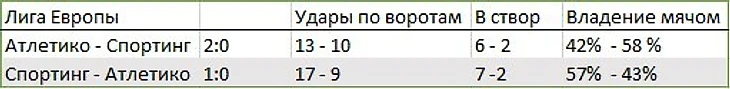 Я намеренно не включал в статистическую подборку матчи ЛЕ со Спортингом. Еврокубковые матчи Атлетико, как и впрочем у Арсенала, существенно отличаются от игр внутреннего чемпионата. Иная специфика, иная мотивация и иные цели. В двуматчевой дуэли с лиссабонским Спортингом статистика выглядела так: