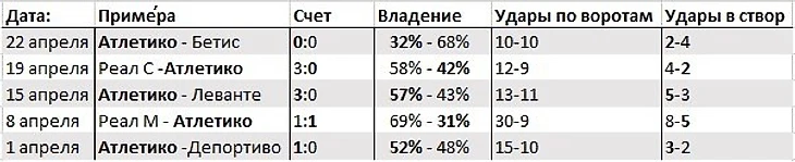 В последних 5 матчах ( во всех турнирах) на выезде "Атлетико" - добился лишь 1 победы, 3 поражения и 1 ничья. Обнадеживает.