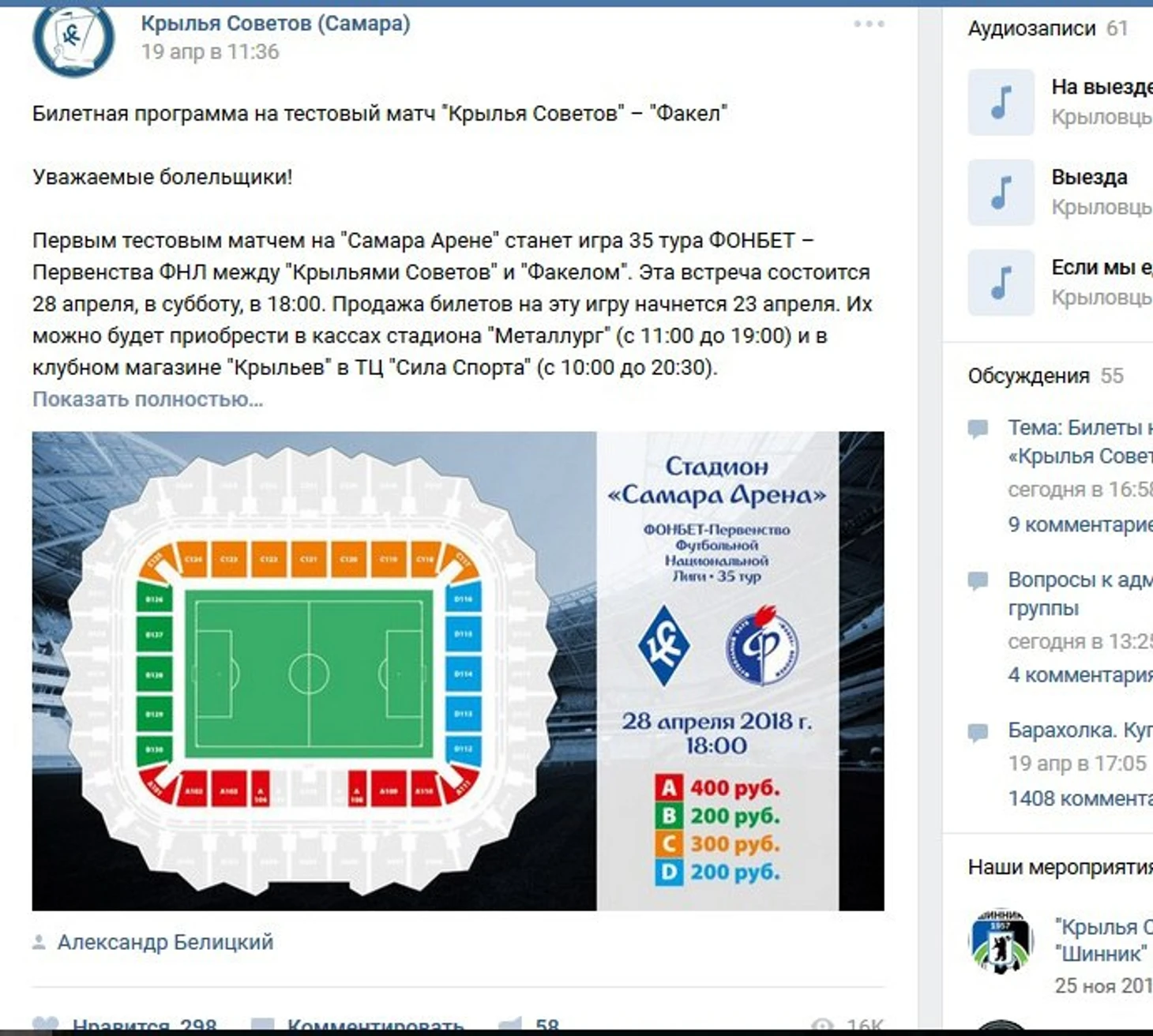 28 апреля в Самаре состоится первый матч на новом стадионе «Самара-Арена», построенном к Чемпионату мира по футболу. Местные «Крылья Советов», сражающиеся за прямой выход в Премьер-Лигу и идущие на третьем месте, примут в гостях воронежский «Факел», который после 34 туров ФНЛ лидирует, правда, по шансам вылететь из турнира. Продажа билетов на матч стартовала 23 апреля в 10 и 11 часов утра, к 16:00 все билеты были раскуплены.