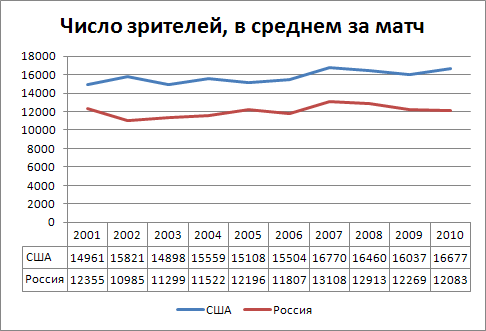 Тот факт что футбол – спорт номер один в России, обсуждению не подлежит. Достаточно посмотреть на статистику самых популярных блогов и записей на Sports.ru: как минимум три четверти всех текстов – о футболе. Удивительно, что такая популярность не очень-то кореллирует с посещаемостью стадионов. Еще из одного материала Д. Навоши, «Уровень чемпионата России растет» я позаимствовал цифры посещаемости в РФ за последние 10 лет. Для сравнения – аналогичная статистика для MLS (Major League Soccer – профессиональная лига соккера в США). «Спорт номер один» против «спорта номер семь».
