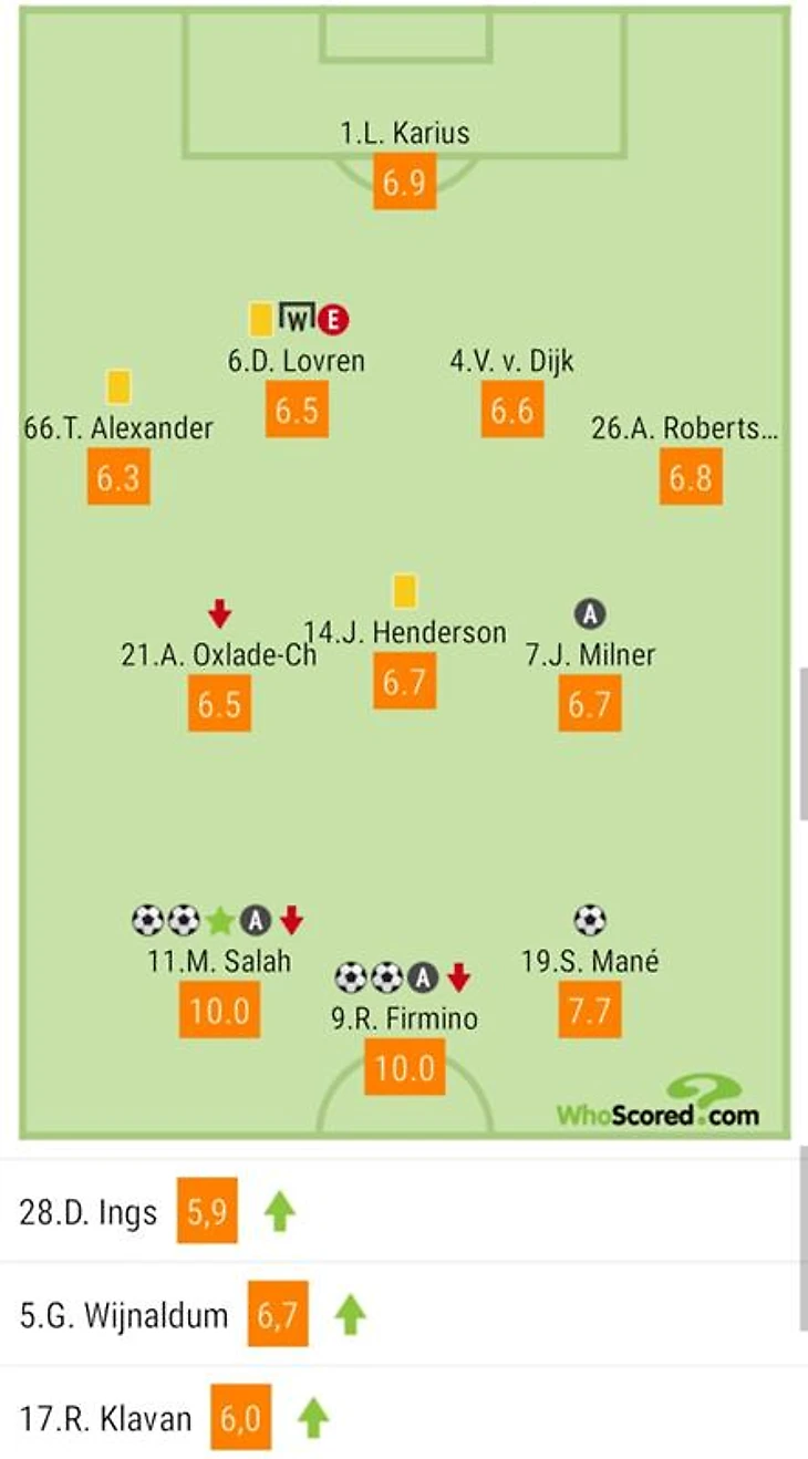 «Лучшими игроками матча» стали Мо Салах и Роберто Фирмино. У обоих 2 гола + 2 ассиста и 10 в рейтинге Whoscored!