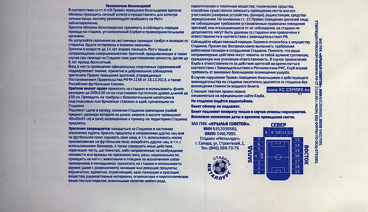 Билеты напечатаны на стандартных бланках, как и на другие матчи ФНЛ. На лицевой стороне написано что матч пройдет на «Самара-Арене», но сзади билета — логотип и схема «Металлурга» - «И так сойдет» в действии. Такой билет не будет ценным экземпляром у коллекционеров, разве только из-за ошибки.