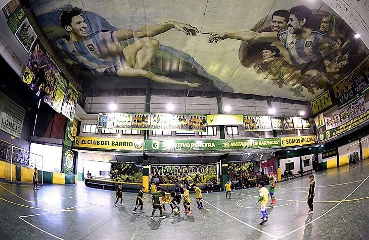 Команда «Спортиво Перейра» из юго-восточного района Барракас, где детей учат играть в мини-футбол, попросила местного художника оживить серый потолок, а неожиданно получила фреску.
