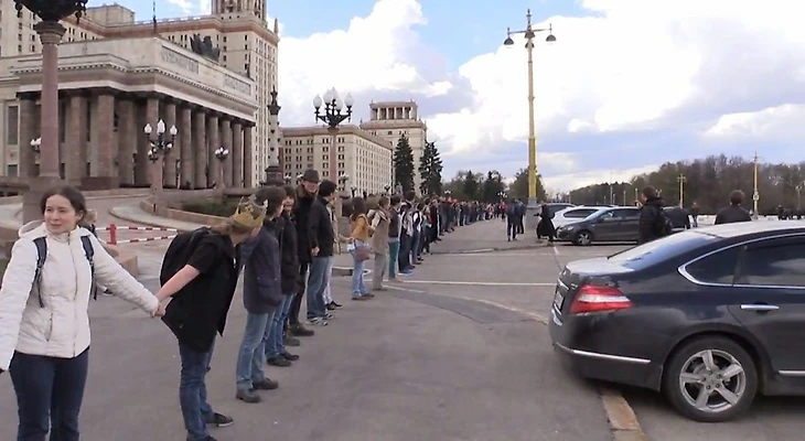 Около 200 человек (по подсчетам профсоюза «Университетская солидарность») поучаствовали в акции «Живой щит», организованной учащимися Московского государственного университета и Высшей школы экономики. Студенты не хотят, чтобы рядом с главным корпусом МГУ на время ЧМ-2018 организовали фан-зону для болельщиков.