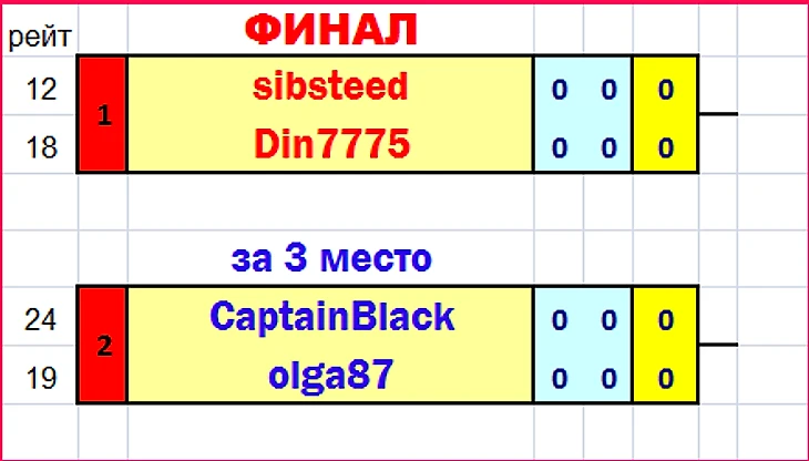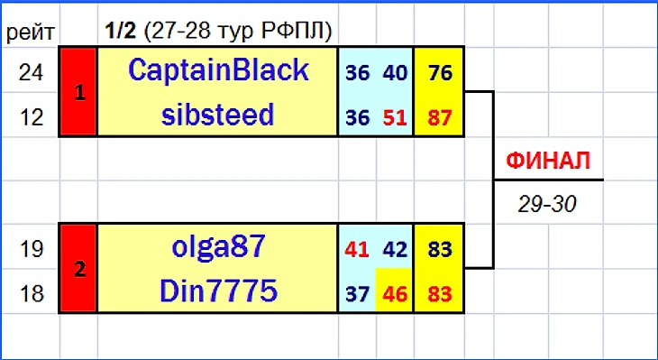 В противостоянии команд Ольги olga87 и Алексея Din7775 была настолько упорная борьба, что по итогам двух матчей определить сразу победителя не удалось и пришлось включить дополнительную опцию регламента - "На стадии плей-офф в случае ничейного исхода, дальше проходит участник, показавший максимальный результат в этом двухраундовом противостоянии с соперником (например 23:20, 21:24, дальше проходит тот, кто забил 24)...". В итоге 46 очков в ответном матче позволили пройти в финал Кубка Алексею!.. а обидное поражение, надеюсь, не позволит выбить из колеи Олю... впереди у нее утешительный финал - "матч за 3 место"