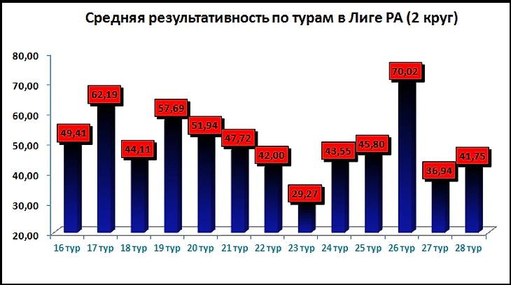 После 28-го тура в прошлых сезонах максимальный результат в Лиге РА был: