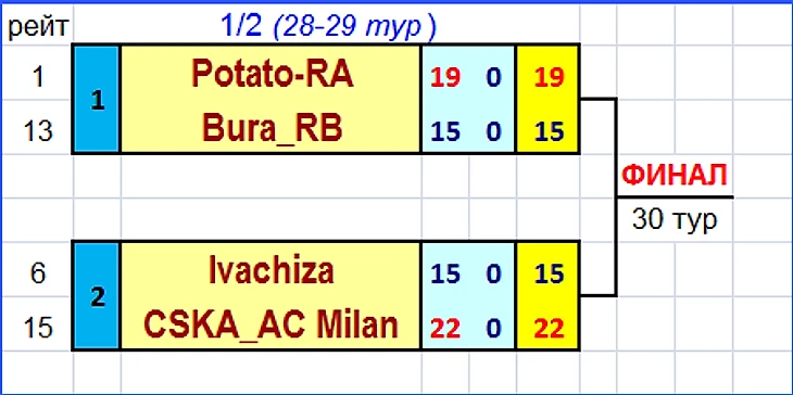В борьбе за золотые медали Чемпионата КП Алексей Potato, за 2 тура до финиша, оторвался от главного преследователя на довольно большую дистанцию в 19 очков... как говорится, теперь проиграть чемпионство может только сам Алексей)... Leha1 должен совершить чудо, чтобы настичь лидера на финише... а вот в борьбе за бронзу ух какая интересная борьба предстоит в заключительных турах... следим за развитием ситуации...