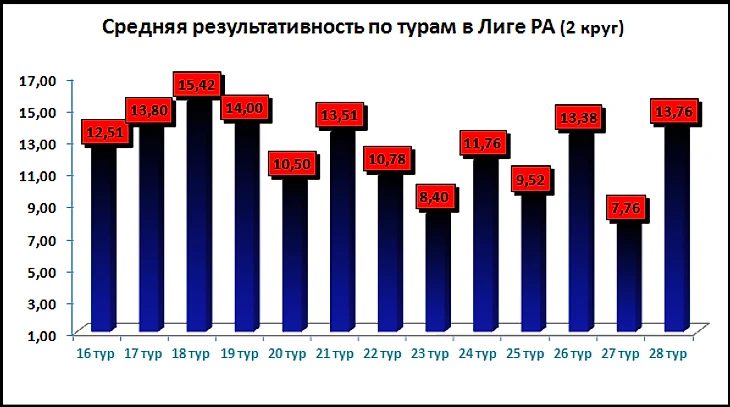 После 28-го тура в прошлых сезонах максимальный результат в Лиге РА был: