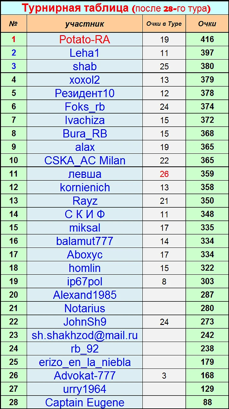 Турниры по прогнозам РФПЛ 2017-2018. Итоги тура №28