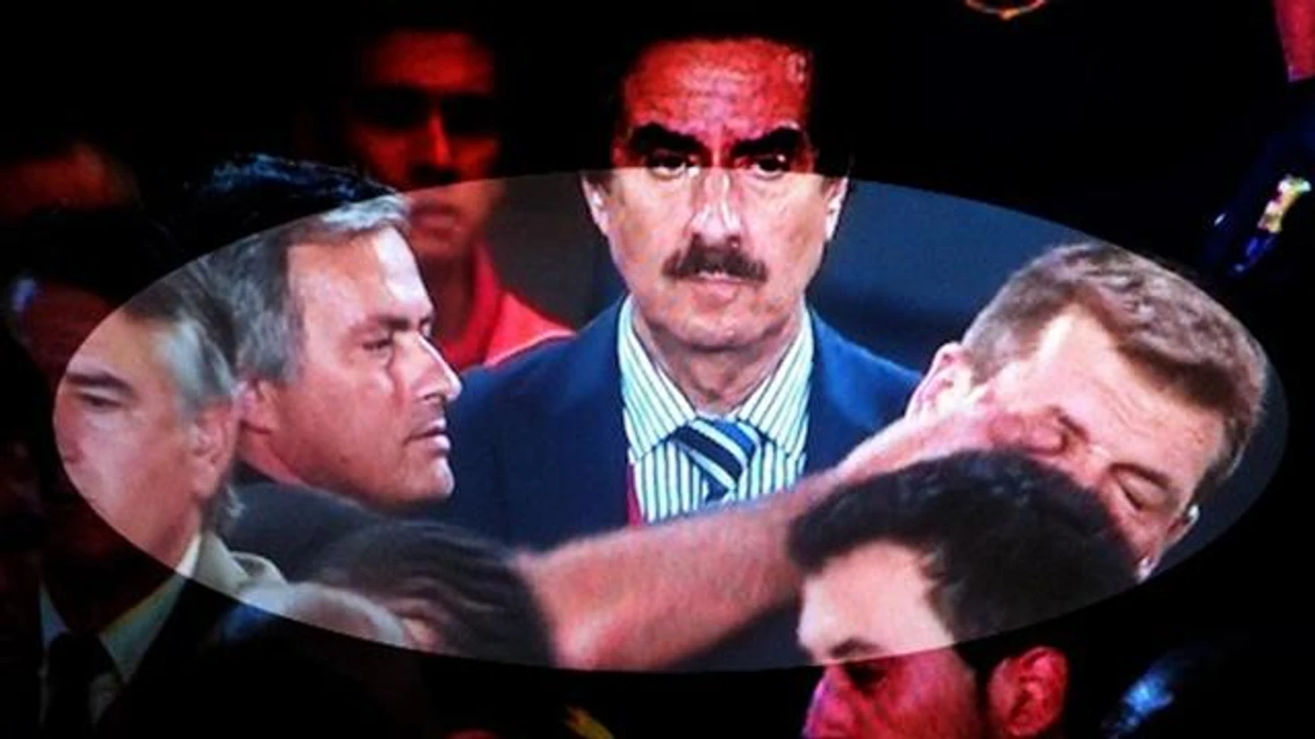 Далее, свою мерзкую душонку решает продемонстрировать Жозе Моуринью. На глазах у всего мира главный тренер королевского клуба подкраслся к помощнику Хосепа Гвардиолы и совершил свой знаменитый тычок пальцем в глаз Тито Вилановы. Затем португалец стал яхидно улыбатся, явно получая удовольствие от содеянного.