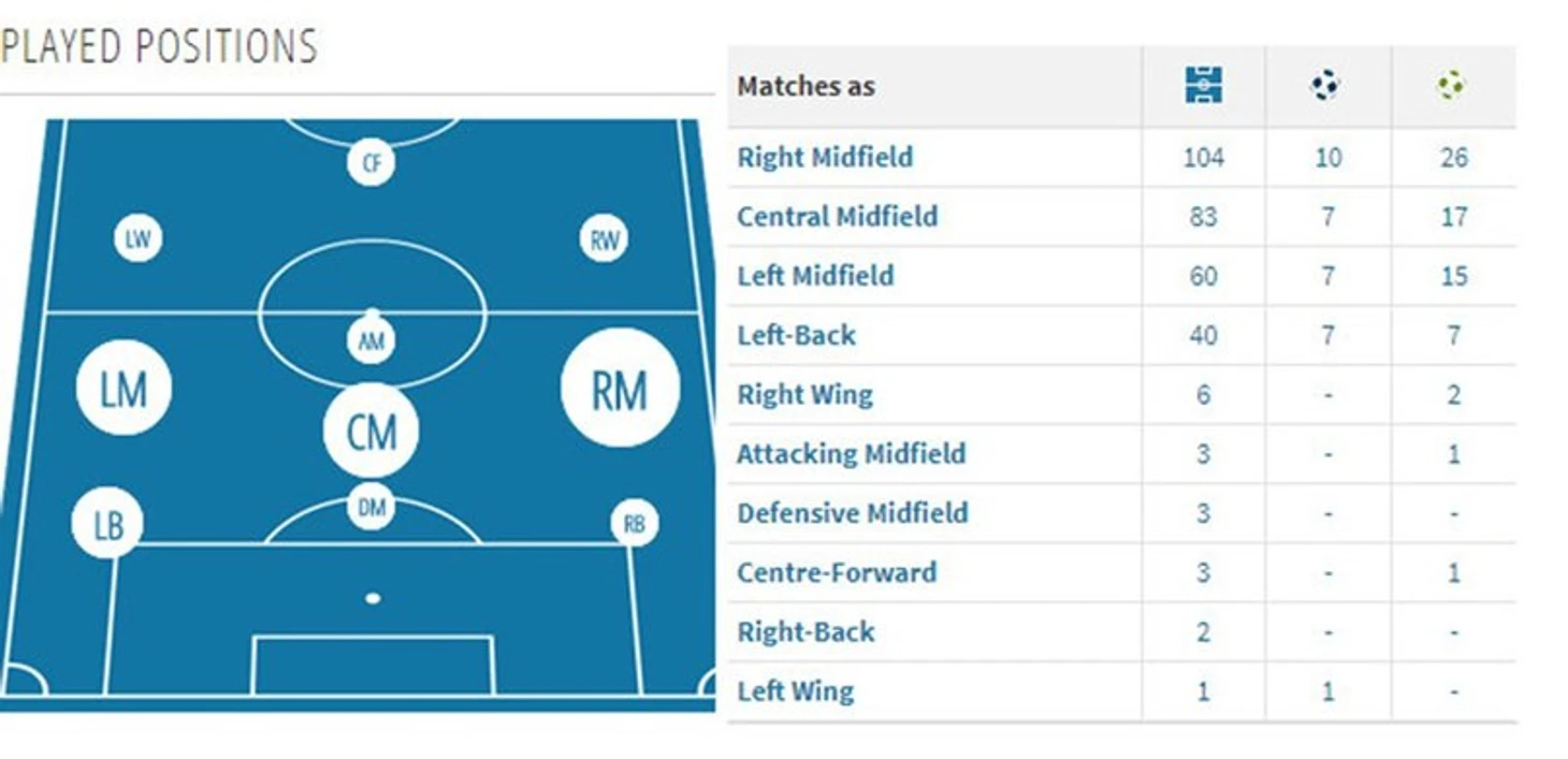 За свою карьеру Милнер играл на 10 позициях. Вот как выглядит карта его позиций. Здесь есть всё. Конечно, имеют значение только те амплуа, в которых он провёл значительное количество матчей. Таких четыре. В защите и полузащите, на левом и правом фланге, в центре. Сказать, что Джеймс универсал, значит, сильно его недооценить.