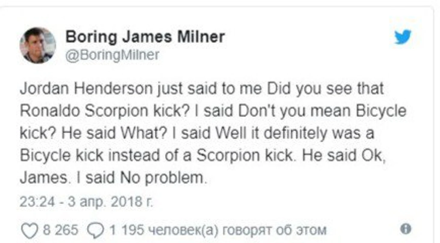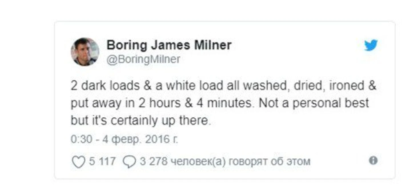 «Быть скучным – это же весело», — решил кто-то и завёл аккаунт в «Твиттере» под названием Boring James Milner – «Скучный Джеймс Милнер». На весну 2018-го у «Скучного Джеймса Милнера» 618 тыс. читателей. Что они читают?