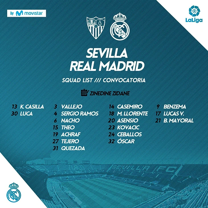 На матч против Севильи, который состоится сегодня в 22.30, Зидан взял 18 игроков. Вне заявки остались травмированный Карвахаль, восстанавливающиеся от повреждений Иско и Роналду, а также Навас, Варан, Марсело, Модрич, Бэйл.