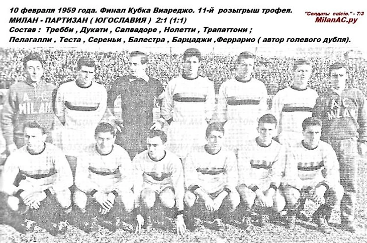 А вот пример из 60-х : матч против лиссабонской "Бенфики"-средний рост команды— 175,8 см. Тут вы чувствуете момент. Защитник Требби - "малыш" в составе лихой банды Нерео Рокко — 171 см. Футбол с годами, несомненно, меняется. Вы этот факт отметили. Суперлидер 1963-ого, Джанни Ривера, — 175 см.