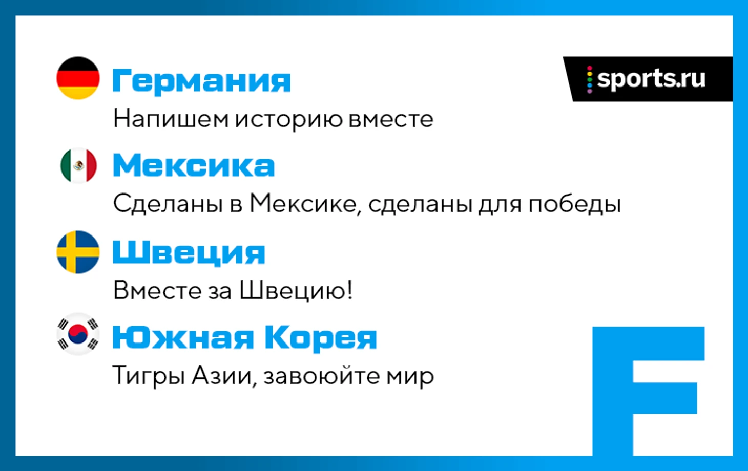 На сайте ФИФА опубликовали официальные слоганы сборных-участниц ЧМ-2018. Все они довольно унылые, но так решили болельщики – слоганы выбирали по итогам массового голосования.