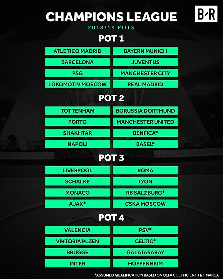 Первая корзина: «Атлетико», «Бавария», «Барселона», «Ювентус», «ПСЖ», «Манчестер Сити», «Локомотив», «Реал»;