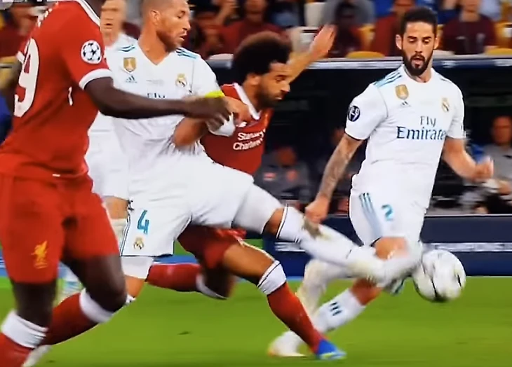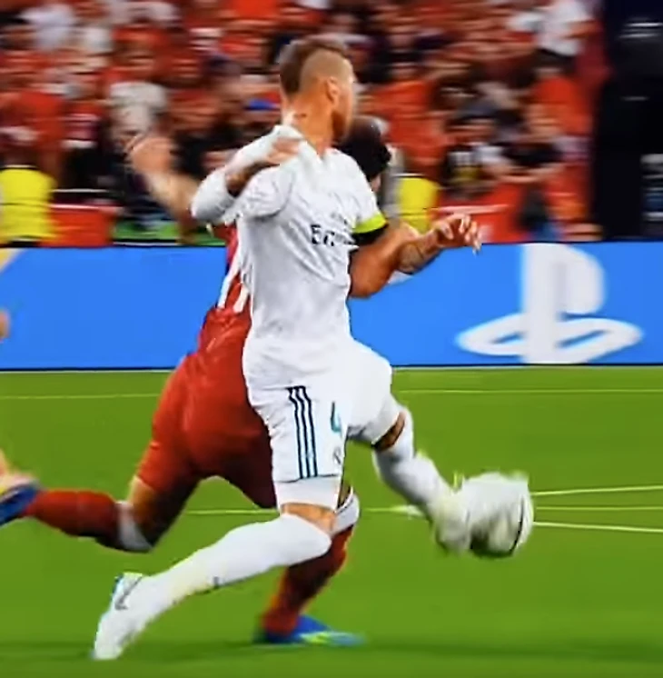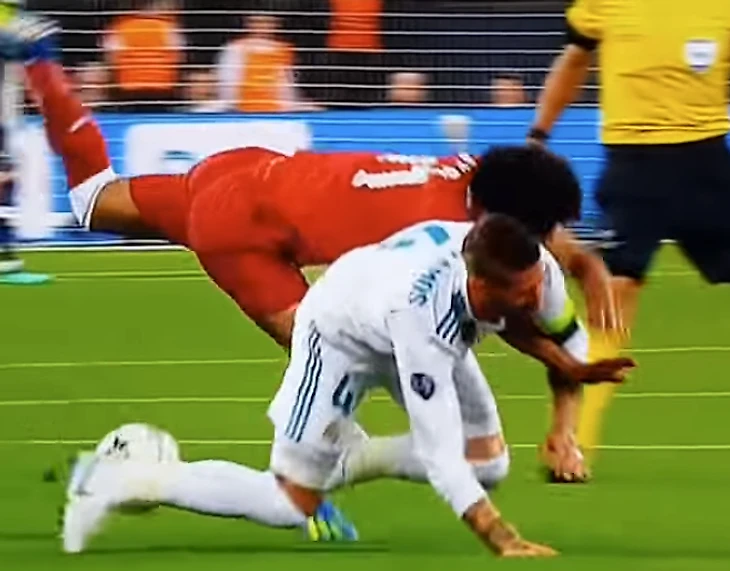 Мохамед Салах хватает локоть Рамоса и падает после единоборства (Рамос играет в мяч), своим локтём тянет за собой Серхио. Рамос, как и любой человек с здоровой нервной системой, рефлекторно выставляет руки вперёд при падении (кто-то из особенно выдающихся комментаторов предлагал Рамосу убрать свой локоть - убрать свой локоть за 2 секунды, когда его держит соперник локтём - это интересная задача). В итоге Салах проиграл единоборство, мяч, и локоть ;) З