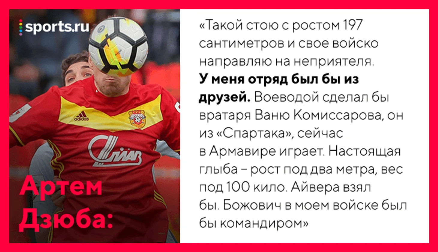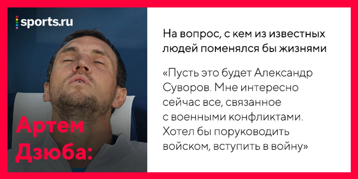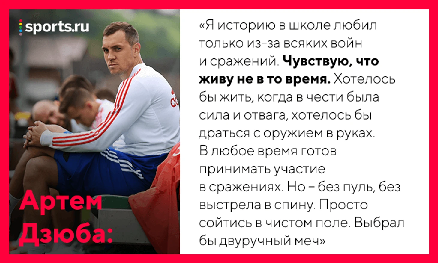Кажется, Артем Дзюба никогда не перестанет удивлять. Самый разговорчивый русский футболист в этом году заговорил о войне. Что еще в школе только за это любил историю. Что хотел бы руководить войском. Что в любое время готов к сражениям.