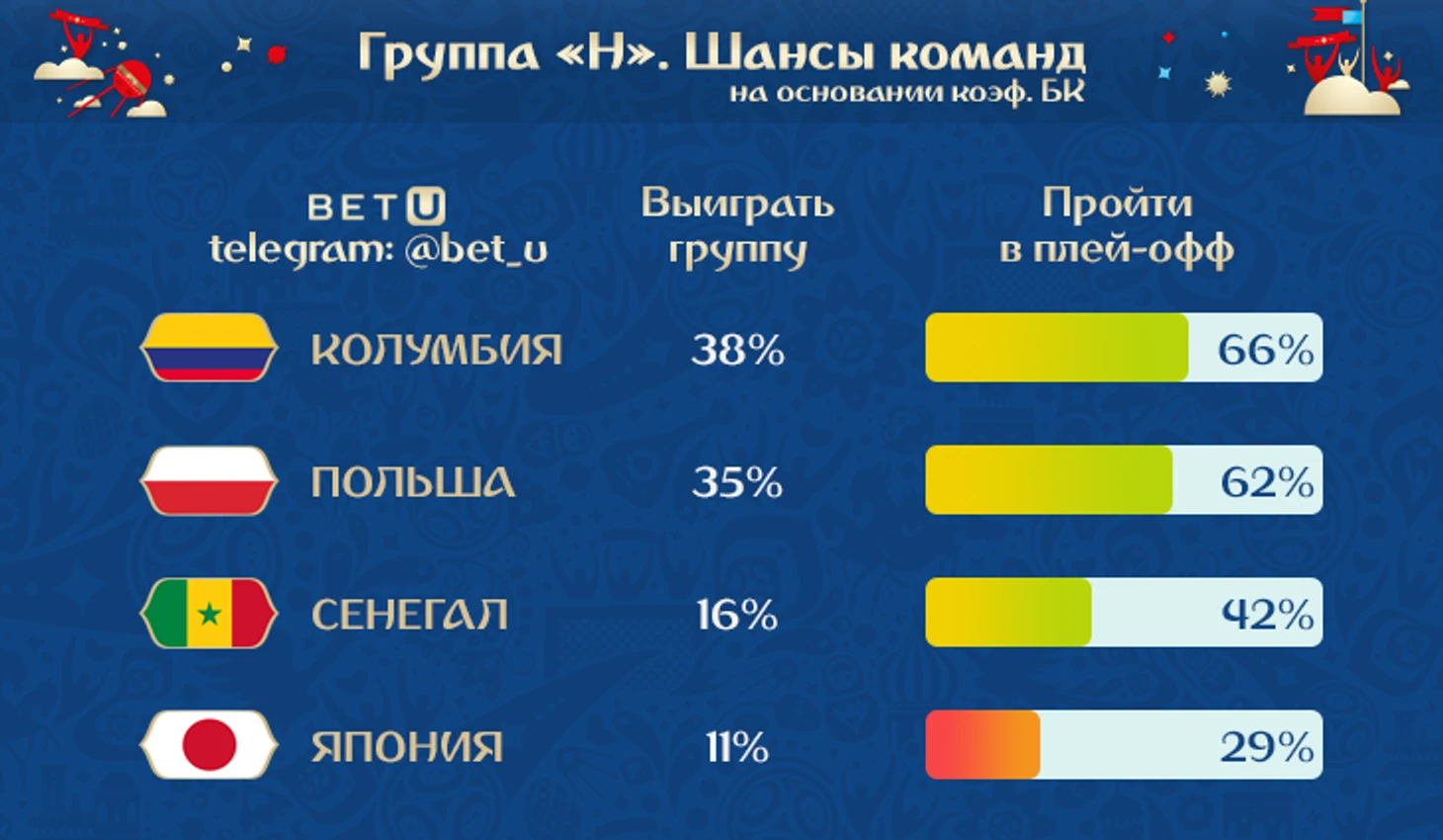 Серия выпусков к ЧМ-2018, посвященная шансам сборных на победы в своих группах и проход в плей-офф. Новый день – новый выпуск! Сегодня – группа «H» с Польшей, Сенегалом, Колумбией и Японией.