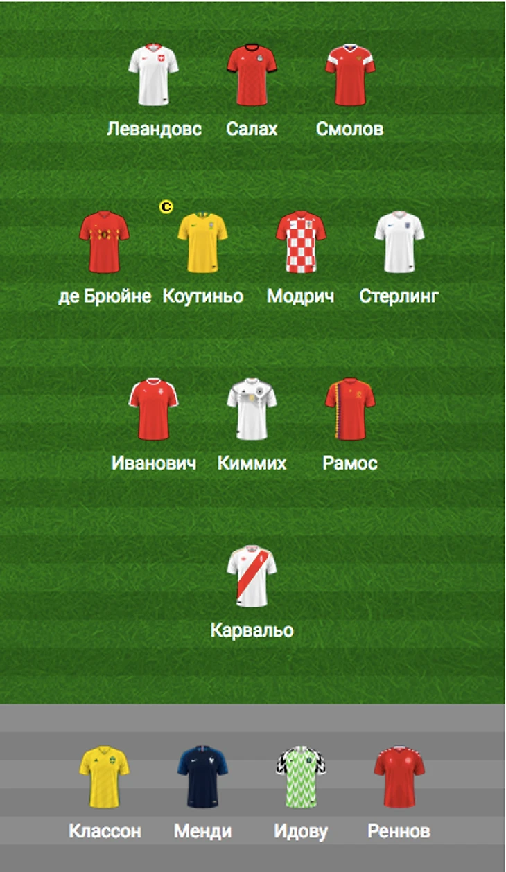 Де Брюйне и Стерлинг - тут все ясно, чемпионы Англии, будут рвать. Взял бы еще Сане, но его прокинули мимо ЧМ. Коутиньо, есть ощущение, наберет много с бразильцами, Модрич будет хорош. Классона взял чисто в запас. Хотя по "Краснодару" он мне очень нравится.
