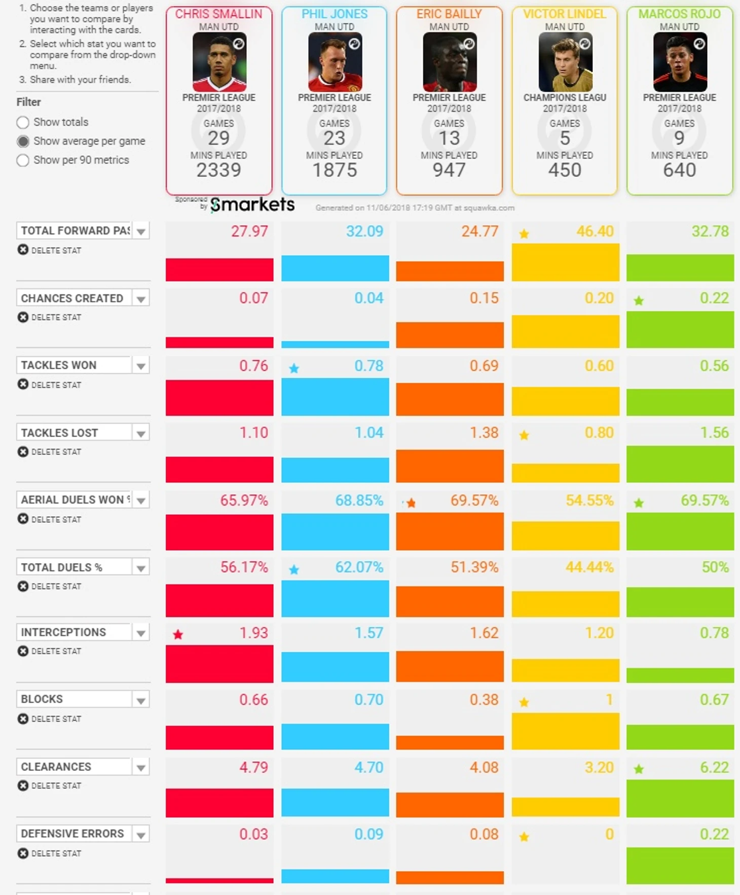 По итогу, Моуринью увидел 2 потенциальные связки: Джонс-Рохо и Байи-Смоллинг. Разберём статистические показатели защитников в сезоне АПЛ 2016-17.