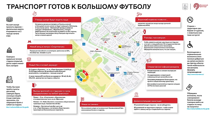 Если брать Москву, то около «Лужников» станция метро «Спортивная» и станция МЦК «Лужники», плюс автобусы до «Парка культуры» Кольцевой линии. Вот тут я не советую идти на «Спортивную», дело в том, что на соседней станции «Воробьевы горы» расположена фан-зона. Так что или МЦК или автобусы до «Парка культуры».