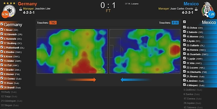 103 касания (Боатенг – 101, Кроос – 98, Озил – 88), 9 навесов (у Мюллера – 7) и 5 ключевых пасов (такая же цифра у Мюллера). Для сравнения, Платтенхардт – 31 касание, 3 навеса и ни одного ключевого паса. Правда, особых дивидендов этот перегруз немцам не принес, потому что все было очень медленно и академично. Что переводы в центр, что на другой фланг. Мексиканцы спокойно успевали перестраиваться или накрывать удары, если до них все же доходило.