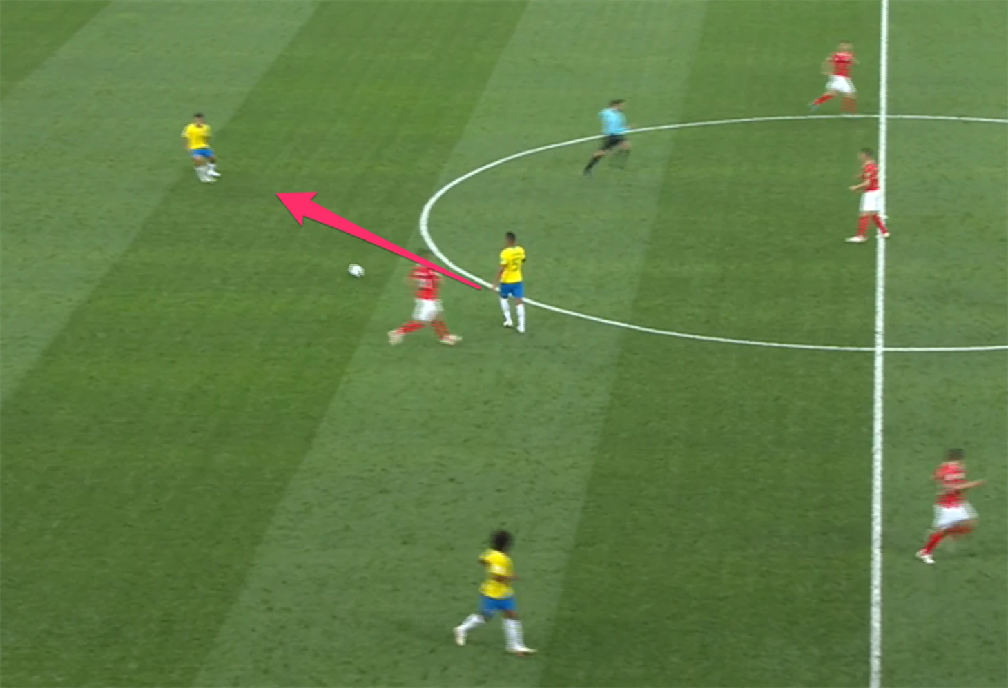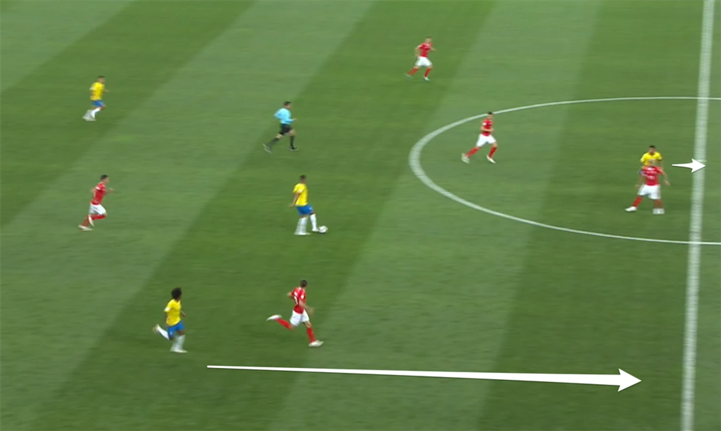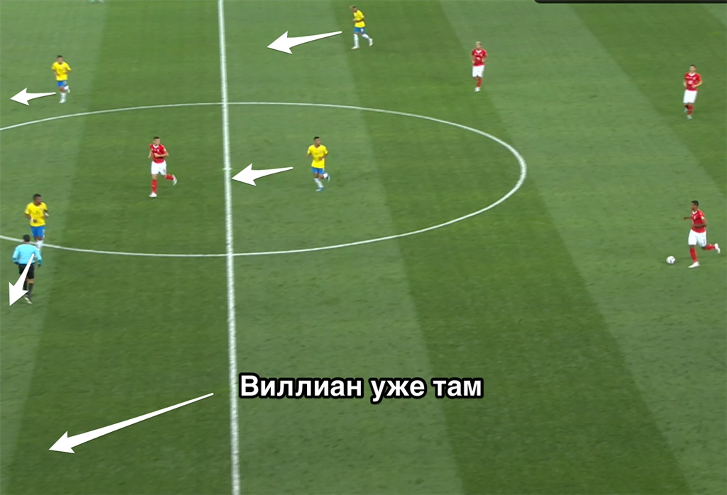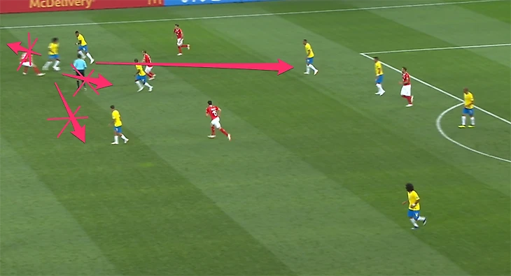 Нельзя сказать, что Бразилия как-то сгоняет всю команду на один клаптик поля и там заставляет рвать. При всем том, как Неймар любит смещаться в центр, на игру команды в целом это не сильно влияет. Команда начинает играть максимально широко