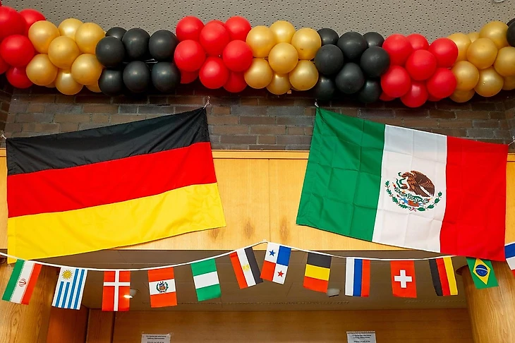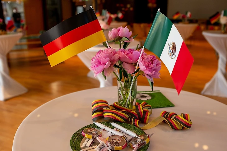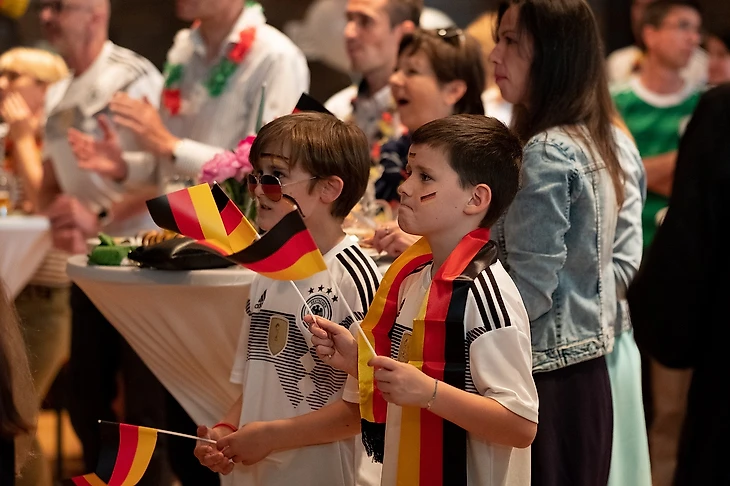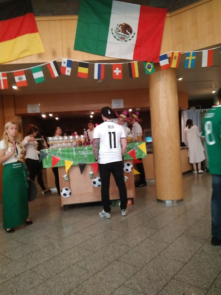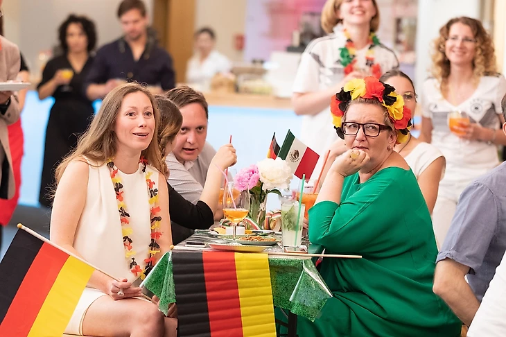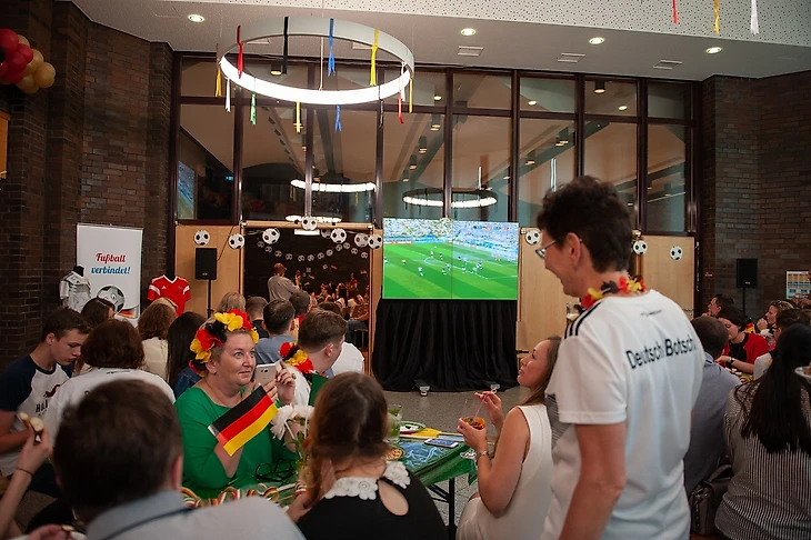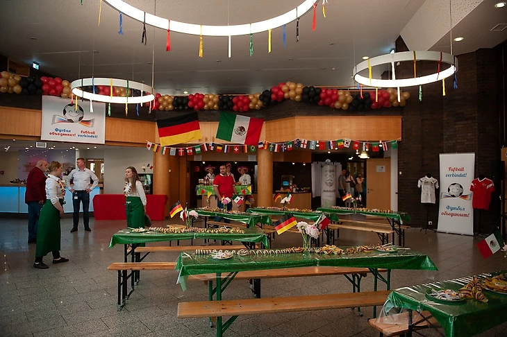 Гостей собирали за час до начала матча, развлекая конкурсами прогнозов и приглашая посетить интересную выставку «Немецкий футбол: напишем историю вместе» в одном из залов диппредставительства. Праздник проходил в дружеской, неформальной обстановке, объединяя в едином порыве переживания за любимую сборную людей всех возрастов, пола, и даже командной принадлежности. На празднике «зажигали» в эффектных нарядах болельщики сборной Мексики, которые также были приглашены и с удовольствием посетили мероприятие.
