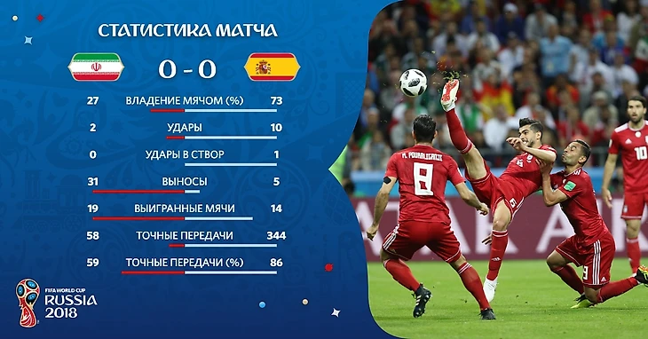 Весь первый тайм было очень тяжело смотреть на игру, которую демонстрировали обе команды. Иранцы всей командой припарковали автобус на своей половине, не пытаясь создать что-либо в атаке. Владение мячом очень долго не смогло принести результат, они распоряжались мячом 73 процента игрового времени. За всю первую половину, единственное, что хорошо получалось у представителей азиатской конфедерации, это отбиваться, совершив 31 вынос мяча. Ну а 58 передач из которых только половина достигла своего адресата, вообще считаются анти-рекордом данного мундиаля. Когда в конце испанцы, стали атаковать все чаще, сборная Ирана пользовалась затяжкой времени, чтобы сбить темп. И честно говоря, это смотрелось очень абсурдно, и хотелось бы, чтобы европейцы наконец забили, что заставило бы иранцев раскрыться и насытить игру.