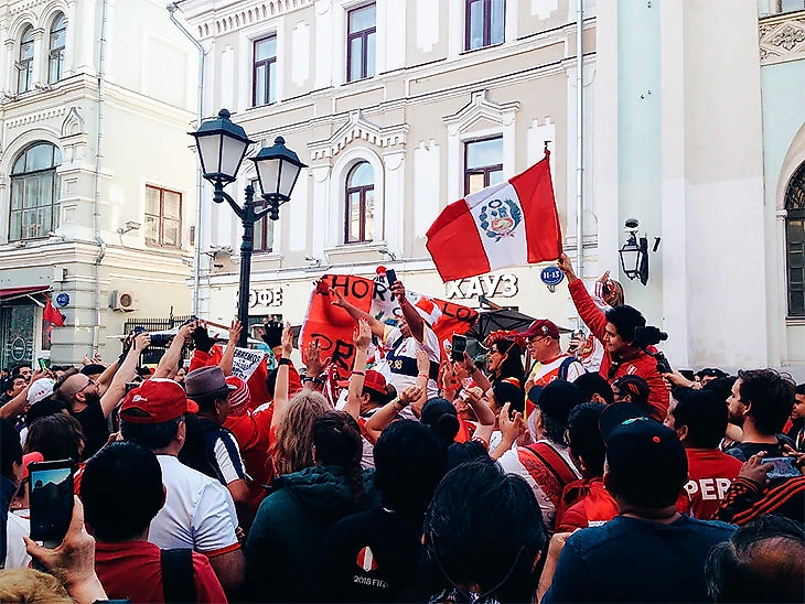 В поезде напротив меня устало плюхнулся бородатый товарищ с огромным рюкзаком. Это был Рикардо, болельщик сборной Перу, который впервые (как и сорок тысяч его соотечественников) посетил Россию. Он с гордостью продемонстрировал мне два значка на его футболке: волка Забиваку и фигурку Апельсина с бутсами на ногах (как оказалось позднее, то был маскот чемпионата мира 1982 года, последнего турнира, на который перуанцы сумели отобраться). Несмотря на усталость, мы проболтали до шести утра.