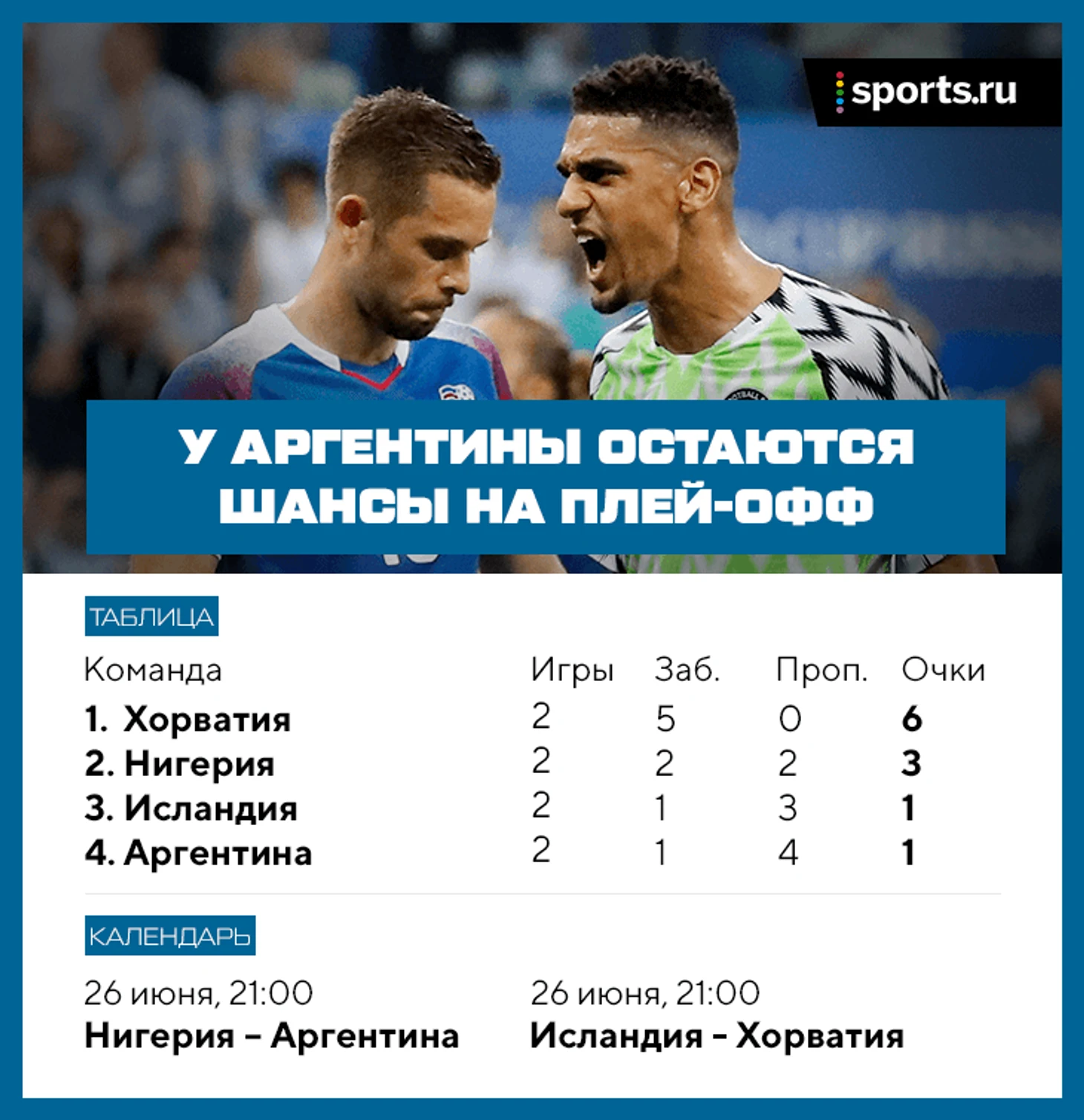 • Чтобы прорваться в плей-офф, Аргентине нужно максимально крупно побеждать Нигерию и надеяться то, что исландцы потеряют очки в матче с Хорватией, которая сыграет полурезервным составом. Аргентинцы могут выйти и при победе исландцев, но в этом случае нужно побеждать Нигерию крупнее, чем Исландия победит хорватов.