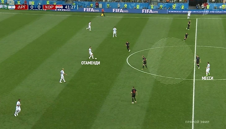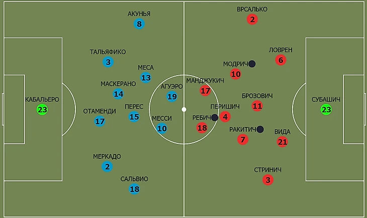 Маскерано и Перес оттянулись назад, в линию обороны, Акунья и Сальвио ушли выше во фланги, в центре только Лео Месси, между Брозовичем и Модричем есть свободная зона, в которую Отаменди может отдать пас, но там нет никого из аргентинцев, продвигать мяч некуда