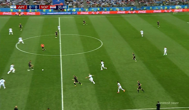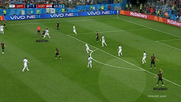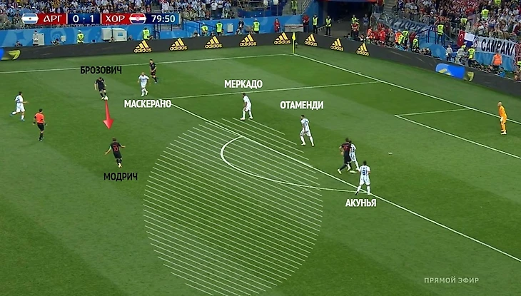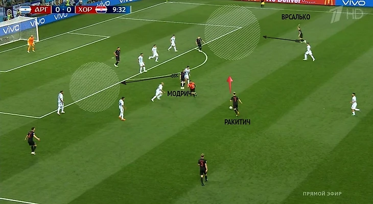 В глаза бросаются сразу две большие зоны у Аргентины: между Меркадо и Отаменди (туда сразу же сместится Модрич), а также на левом углу штрафной за спинами Акуньи и Месы, именно туда на врывающегося Врсалько отдаст передачу Ракитич. В этом эпизоде от гола спасет только неточный перевод Врсалько на Ребича, который находился во вратарской совсем один
