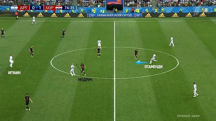 Отаменди выдвигается вперед, чтобы начать атаку передачей на Игуаина, но замысел читается: во-первых, Модрич перекрывает направление передачи на Маскерано; во-вторых, хорваты располагаются достаточно компактно, и их капитан успевает среагировать и перехватить передачу