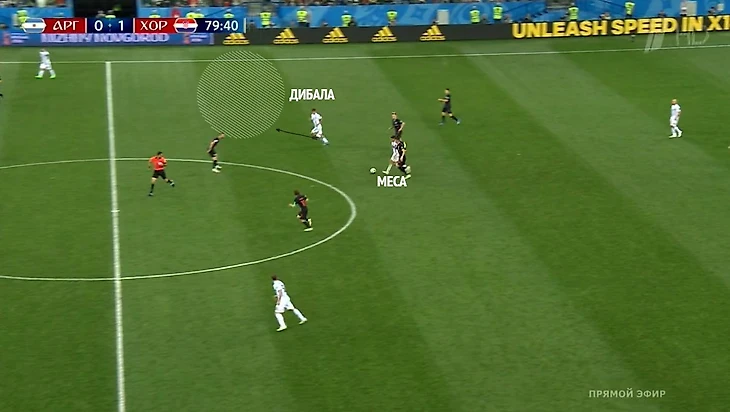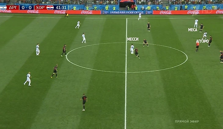 Месси опускается за мячом на свою половину поля. В отличие от первого тайма, теперь нет расположения пятерки защитников в линию, но грамотная позиционная игра хорватов все равно не позволяет продвигать атаку через центр. Игуаин и Перес перекрыты, из свободных вариантов только Маскерано и защитники, с продвижением мяча снова проблемы