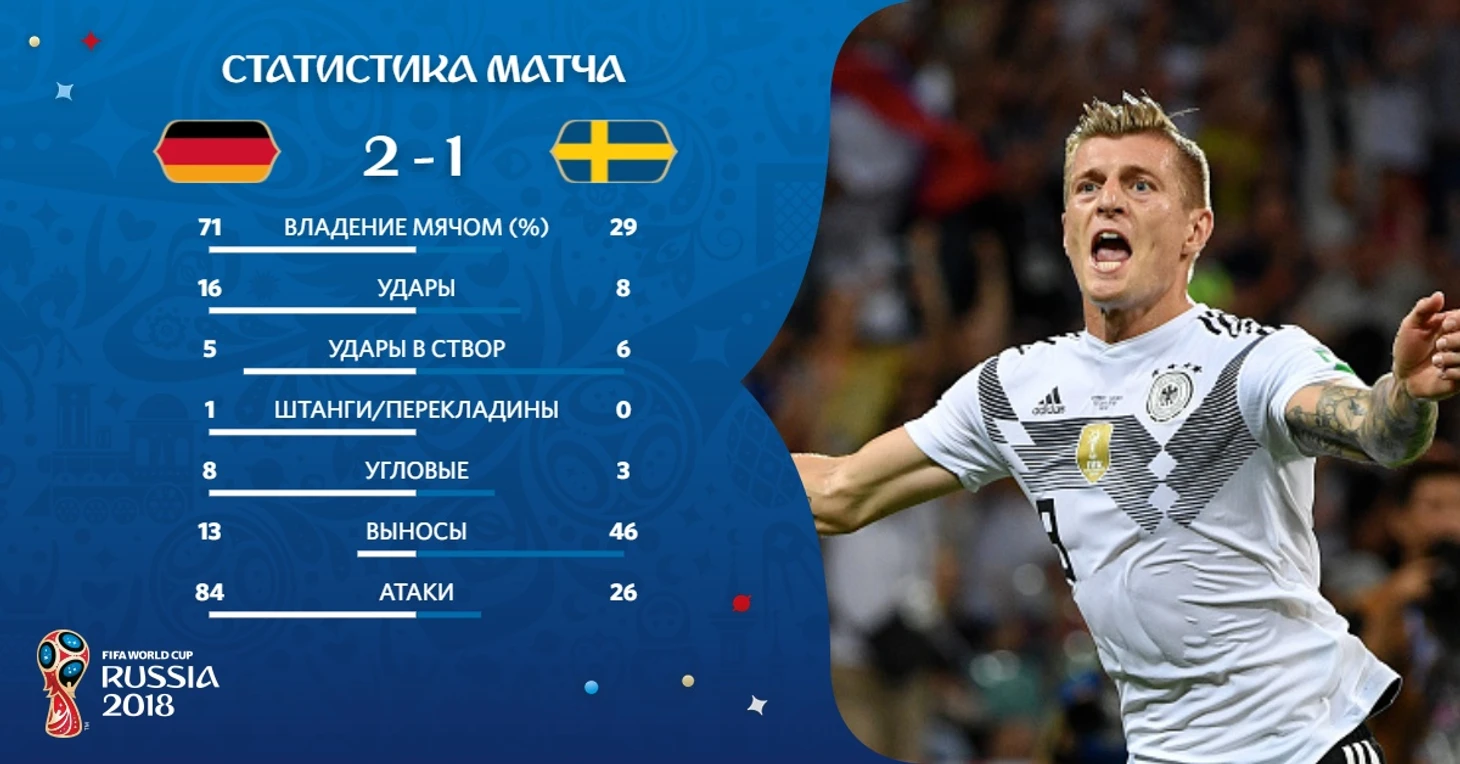 На второй тайм обе команды выходили с совершенно разными целями. Шведам нужно было попытаться удержать хотя бы ничью, которая повышала их шанс на выход из группы. Но это было не суждено. Немцы имели сверхмативацию. На 48 минуте Марко Ройс таки положил мяч в ворота противника. И заставил своих партнеров давить и дальше. Эти 15 минуты после пропущенного гола были наверное самыми тяжелыми для все шведской команды. Они не могли выйти дальше своей половины. И казалось что все таки немцы выйдут победителями из этой игры. Но очень часто в игру вступал Ольсен либо же им просто не везло. Дело ухудшило и удаление центрального защитника Боатенга. После чего, дабы дожать соперника, на поле вышел Юлиант Брандт. И надо сказать удачно. Первым же ударом он попал в штангу. И уже в концовке, сфолив в свой штрафной, сборная Швеции получила опасный штрафной около своих ворот. И феноменальным ударом в дальнюю девятку отправил победный мяч, не самый лучший по игре, Тони Крос. Вот так бывает. В футбол играют и обороняются 11 футболистов, а побеждают в конце обязательно немцы