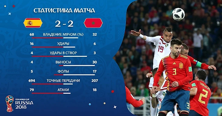 Марроканцы, проигравшие оба предыдущих матча, уже не имели шансы на выход из группы. Но громко хлопнуть дверью, обыграв испанцев, им все таки хотелось. В всех прошлых встречах им очень сильно не везло. Они не реализовывали множество моментов, в отличии от своих соперников. Но кажется к последней игре им удалось добиться того чего мы так хотели увидеть. Они очень легко проходили расслабленную оборону испанцев. Длинные передачи вперед на быстрого Бутаиба с легкость проходили сквозь Рамоса и Пике. Не обошлось и без очередных ляпов от Де Хеа. На этом турнире он показывает далеко не лучшую игру. От поражения испанцев спасало лишь мастерство игроков атакующей и средней линии. То какие трюки совершал в атаке Иско заслушивает отдельного внимания. Замечательно весь матч африканская команда играла и на втором этаже, выигрывая практически все единоборства. Именно этот факт и привел к тому, что второй гол они забили после подачи с углового. В моменте, когда испанцы забили свой второй мяч, произошла полная неразбериха. Судья показал, что угловой нужно подавать с левого флажка, но испанцы подали справа. Да нельзя не отметить красивый гол Яго Аспаса, но это момент который повлиял на игру. Тем более, что этот гол решал и судьбу итогового расположения команд в группе.