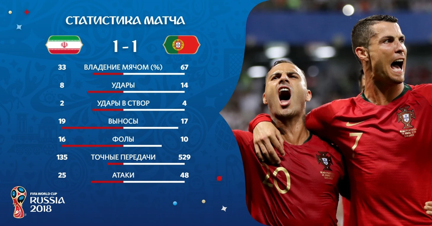 Интрига в группе В продолжала держаться до последнего тура. Даже Иран имел возможность занять первое место. В качестве основной игры я выбрал именно матч с участием португальской команды. Зная о том, что первое место дает выход в 1/8 финала сборную России, подопечные Сантуша хотели занять именно лидирующую позицию. Матч был целиком и полностью пропитан невероятными моментами. С самых первых минут европейская команда неслась вперед на всех парах, но очень плотная оборона иранской команды.( с которой с трудом справлялась даже испанская атака). Каждый раз, когда мяч доходил до Роналду обязательно создавался очень опасный момент. Но по такому количеству моментов гол, который был забит лишь в самой концовке первого тайма, можно сказать, что случилось это довольно таки поздно. Во втором тайме интерес к игре подогревался еще сильнее. Иранцы решились таки начать атаковать и переставать играть по счету. Для них это не в первой. В матче со сборной Испании они тоже начали активно атаковать лишь во втором тайме после того как пропустили. На 53 минуте накал страстей достиг своего пика. с помощью видеоповтора был назначен пенальти в ворота представителей азиатской конфедерации. И счет мог бы увеличиться, но героический сейв Бейранванда оставил шансы своей команде. Далее по ходу встречи обе команды обменивались атаками, но к забитым мячам они так и не приводили. На 83 минуте настал момент, когда вздохнули все болельщики сборной России( на тот момент в таблице Португалия была выше Испании) и Португалии. После удара по лицу от Роналду, судья пошел смотреть повтор момента на предмет красной карточки. Но все обошлось и португалец отделался лишь предупреждением. Этот матч скорее всего установил рекорд по количеству просмотров видеоповторов, ведь уже на 93 минуте судья поставил пенальти уже в ворота европейцев, который уверенно сравнял Ансарифард. Такой результат уже не обеспечивал португальцам выход на нашу сборную и поэтому им нужно было атаковать. Но в атаку еще сильнее пошел Иран, но в самом конце встречи стопроцентный момент упустил Азмун. а ведь этот гол бы давал обеспечивал Ирану первую строчку в таблице, так как Испания на тот момент играла вничью с Марроко. Но момент не был реализован, на этом матч и закончился. После истечения 90 минут на лица иранских футболистов было тяжело смотреть, они были убитым тем, что исторический выход в плей-офф был так близок.