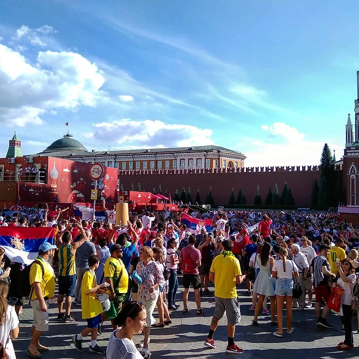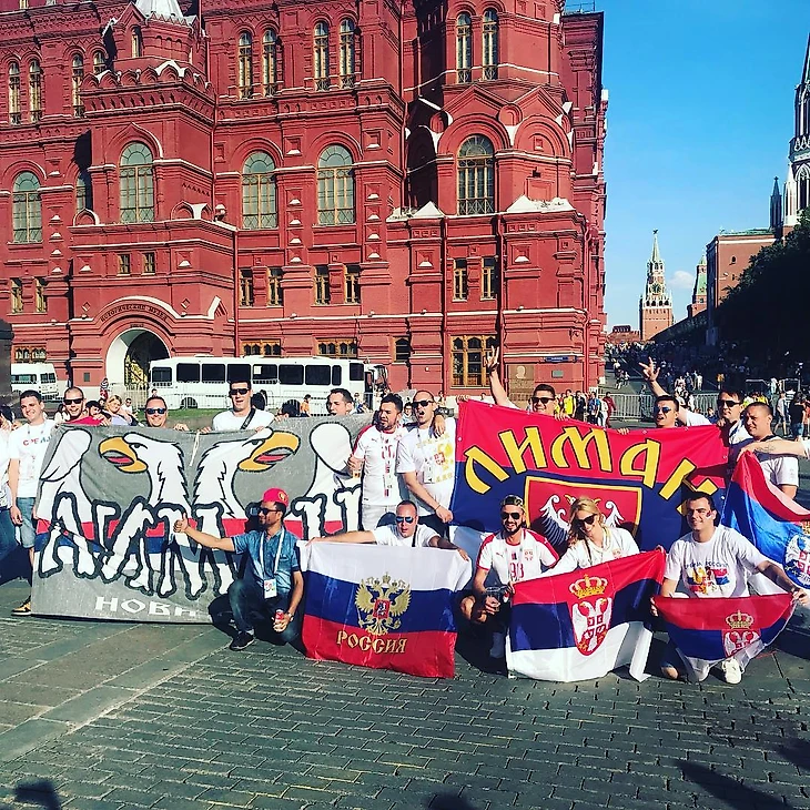 27 июня Сербия играет с Бразилией в Москве. Перед матчем сербы оккупировали Красную площадь. Сначала около двух тысяч человек прошли по Никольской, где показали бразильцам, как надо петь: