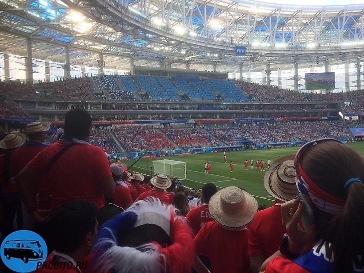 К гимну Англии я отправился к англичанам и думал подольше потусить с ними поближе, но оттуда прогнали стюарды, которые не пускали к перегородкам и отправляли на своё место. «Боже храни Королеву» услышал, успокоился и пошёл к местам. Пока шёл увидел первый гол британцев, пока располагался — второй ) Вообще спасибо людям в зелёных манишках, направили меня куда надо — в сектор панамцев. Несмотря на пять пропущенных мячей в первом тайме эти люди пели и были в крутом настроении. Любой переход их команды на сторону соперника сопровождался вскакиванием с мест и эмоциональнам подбадриванием. Женек параллельно накидывал на испанском, так что время провели знатно. Что и говорить, мы увидели первый гол Панамы в истории ЧМ, который был отпразднован метанием пивных бокалов в воздух.