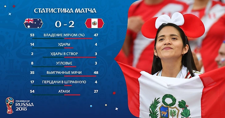 Вот где поистине продолжался футбол достойный чемпионата мира в тот вечер. Обе команды уже практически потеряли шансы на выход из группы, но все равно старались показать неплохую игру. Австралийцы демонстрировали симпатичную игру во всех матчах, но этого конечно не хватит, чтобы попадать в плей-офф. Перуанцам же очень много не везло на протяжении всех игр, их главной проблемой была низкая реализация, имея столько шансов они так и не смогли ни разу забить. Но кажется в тот вечер они смогли нащупать свою игру, жаль что так поздно. Австралия хоть создала почти в 2 раза больше атак так и не смогла превратить их хотя бы в один забитый мяч. Все таки южно-американцы слишком хорошо смотрелись в тот вечер. Уже на 18 минуте фантастическим ударом с лета гол в дальний угол положил нападающий футбольного клуба Уотфорд Андре Каррильо. А на 50 минуте преимущество в счете увеличил легенда всего перуанского футбола Паоло Герреро. Порадовав напоследок своих болельщиков, сборная Перу завершила свое выступление на турнире. Очень жаль, что это произошло так быстро, за то время что они были в нашей стране мы слишком сильно их полюбили. Мы никогда не забудем вечно веселых перуанских болельщиков, которые определенно добавляли красок нашему чемпионату.