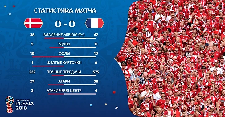 Для обеих команд заключительный тур уже фактически ничего не решал, так как Австралия навряд ли смогла бы навязать борьбу перуанцам. Характер борьбы за первое место в этом матче тоже не проглядывался, Дания как бы и не претендовала на верхнюю строчку и любезно уступала ее трехцветным. Франция и не пыталась играть даже в пол силы. Этот матч был очень похож на последний матч группового этапа Евро-2016, когда в паре с Швейцарцами они расписали мировую, устраивавшую обе команды. По правде говоря, за этой игрой было очень трудно и неинтересно наблюдать. Веси первый тайм обе команды просто катали мяч в центре и никто даже и не пытался что-то создать у чужих ворот. Запоминались лишь несколько попыток Французов создать момент после серии успешных передач. Но больше ничего из этой игры выделить было нельзя. И второй тайм я уже наблюдал за последней игрой перуанцев уже очень многим они полюбились. Но переключив трансляцию, я ничего не потерял, моментов стало еще меньше, а игра еще менее интереснее. Жаль, что решающий матч запомнится лишь тем, что станет скорее всего единственной сухой игрой на таком крутом мундиале.