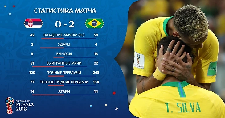 Сербам проиграли решающий матч за выход из группы швейцарцам. Поэтому для решения своих задач им нужна была только победа. Но давайте на чистоту, кто в здравом уме мог бы поверить, что бразильцы проиграют и останутся за бортом турнира, ведь Швейцария играла в это время с уже вылетевшими коста-риканцами. Да и сами сербы не внушали особого доверия. Множества проблем в атаке, когда Митрович не реализовывал стопроцентные моменты. Средняя линия совершенно отсутствовала абсолютно во всех играх. Они не доставляли мяч на чужую половину и с легкостью пропускали соперников сквозь себя. Сборная Бразилии тоже неидеально проводила свои встречи. У них возникали трудности с проходом плотной обороны, а там где звезды должны были брать игру на себя, они терялись. Очень большой проблемой для дальнейшего выступления на турнире может стать травма Марсело. Если говорить по игре, то южно-американцам очень хорошо получалось проходить оборону с помощью контратак с использованием забросов. Именно так на 36 минуте счет открыл Паулиньо. Далее по ходу всей встречи бразильцы имели множество моментов, но они не приводили к голу. А сербы все так же пороли момент за моментом. Но на 68 минуте в игре все стало абсолютно понятно. когда гол после подачи углового забил Тьяго Силва.