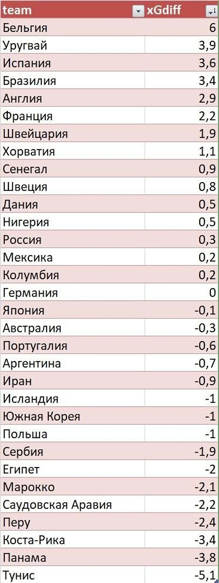 xGdiff по итогам группового этапа. Уругвай и Испания неожиданно в топе.