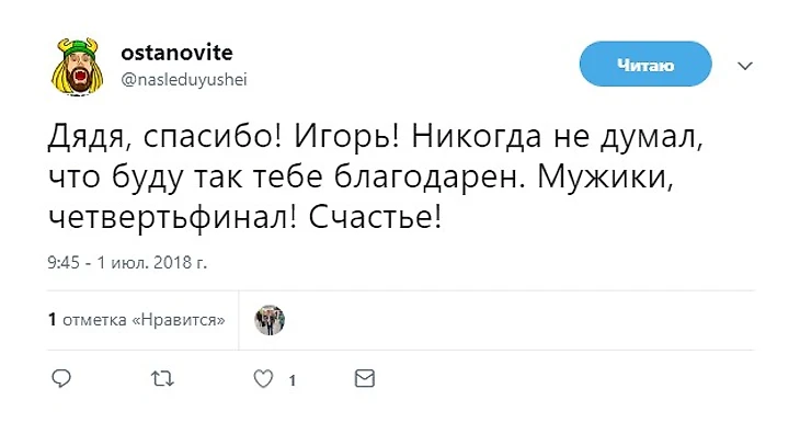 Когда я увидел, как после удачной серии пенальти против испанцев, лента моего твиттера была переполнена положительными отзывами в адрес нашего капитана, причём от людей ранее не скрывавших своего отвращения к первому номеру России, я был в не себе от радости. Я застал тот самый момент, когда рождается герой поколения! Я видел своими глазами как человек превращается в кумира миллионов! И этот человек – вратарь нашей сборной!
